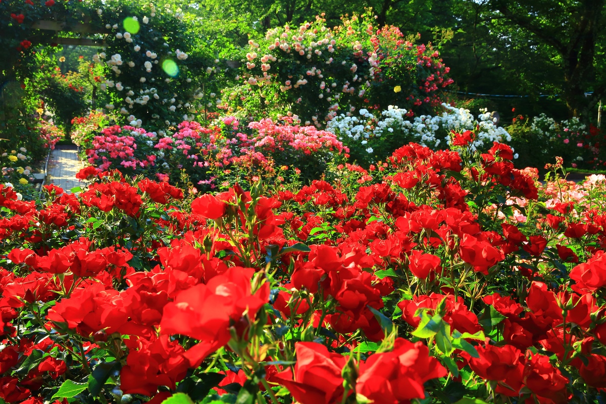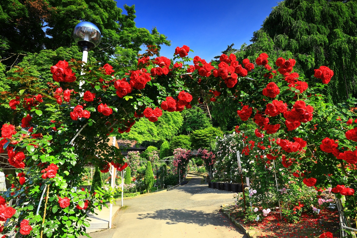 Opened in 1960, this historic rose garden spreads across roughly 16,500 square meters (about 5,000 tsubo) and features more than 6,000 rose bushes from about 450 varieties, letting you enjoy the differences in fragrance and color as you stroll.