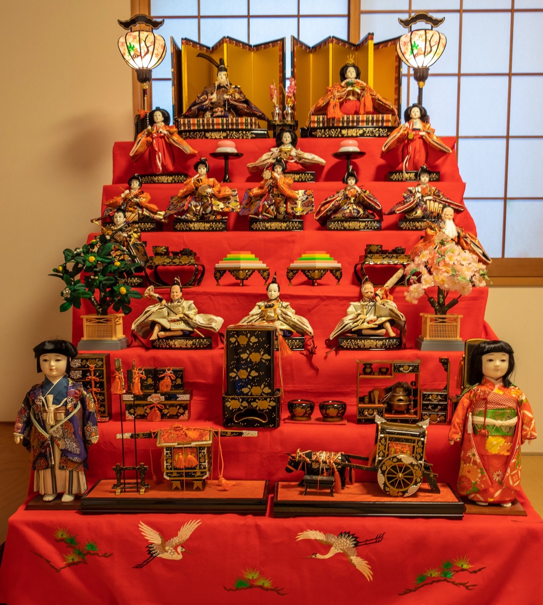 During the Edo period, displays expanded from just the imperial couple to include court ladies and musicians, leading to the development of elaborate multi-tiered arrangements.