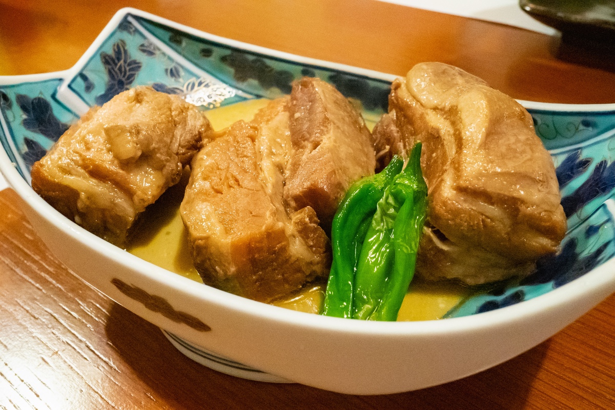 Pork belly is slowly simmered with awamori, soy sauce, and brown sugar,