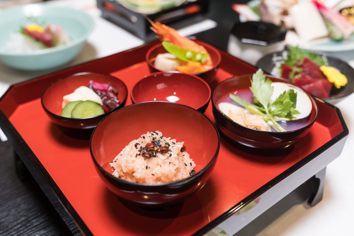 Following the traditional "ichiju sansai" (one soup and three side dishes) format, the meal usually consists of five items: sekihan (red bean rice), osuimono (clear soup), grilled fish (sea bream), nimono (simmered dishes), and konomono (pickles).