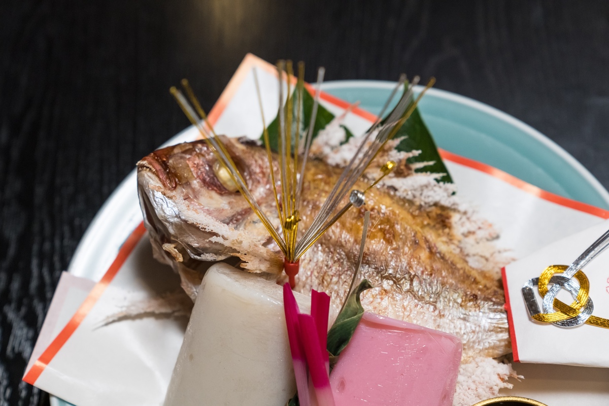 Sea bream (tai) is the most common choice for the grilled fish, though the specific types of fish and side dishes vary by region and household.