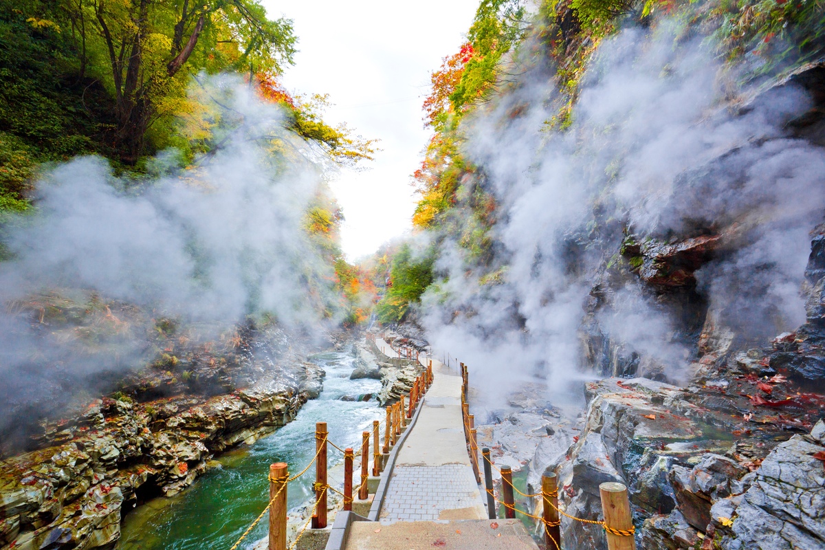 신록에서 단풍까지 계절마다 풍경이 바뀌고, 특히 가을은 빨강과 노랑으로 물든 협곡과 하얀 수증기의 대비가 인상적이에요.