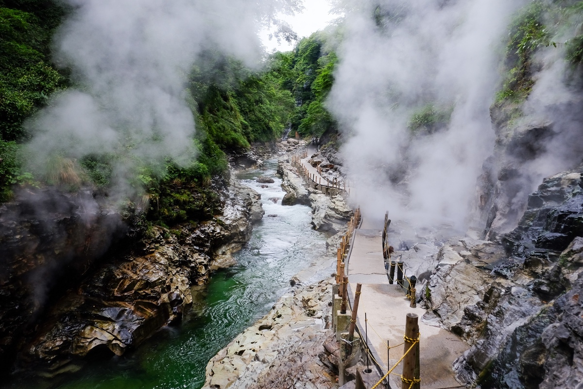 미나세가와(Minase-gawa) 급류가 오랜 세월에 걸쳐 깎아낸 고저차 약 60미터의 V자 계곡 속에서, 바위 틈새로 고온의 열탕과 하얀 수증기가 힘차게 뿜어져 나오는 경관을 볼 수 있는 것이 큰 특징이에요.