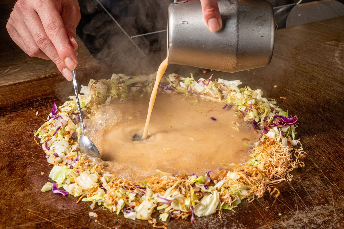 โอโคโนมิยากิใช้แป้ง น้ำซุป ไข่ และกะหล่ำปลีเป็นฐาน รวมกับหมูหรืออาหารทะเล