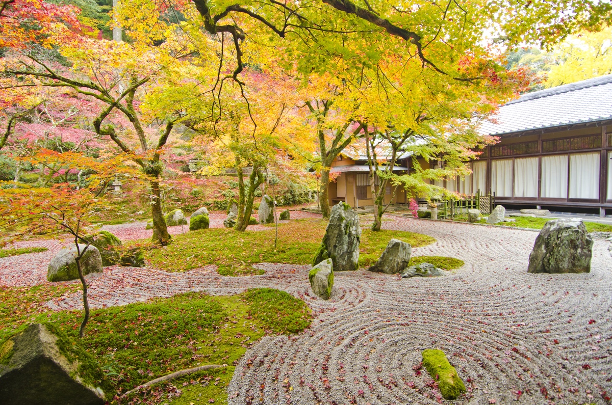白砂的洲滨纹样、以立石为中心的石组与众多枫树和谐共存,以新绿和红叶景观而闻名。
