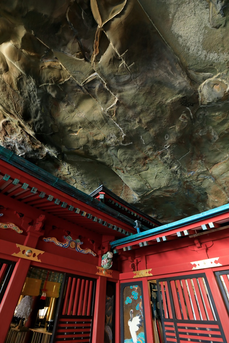 朱红色的社殿在岩石间显得格外醒目,引导着访客进入神秘的世界。