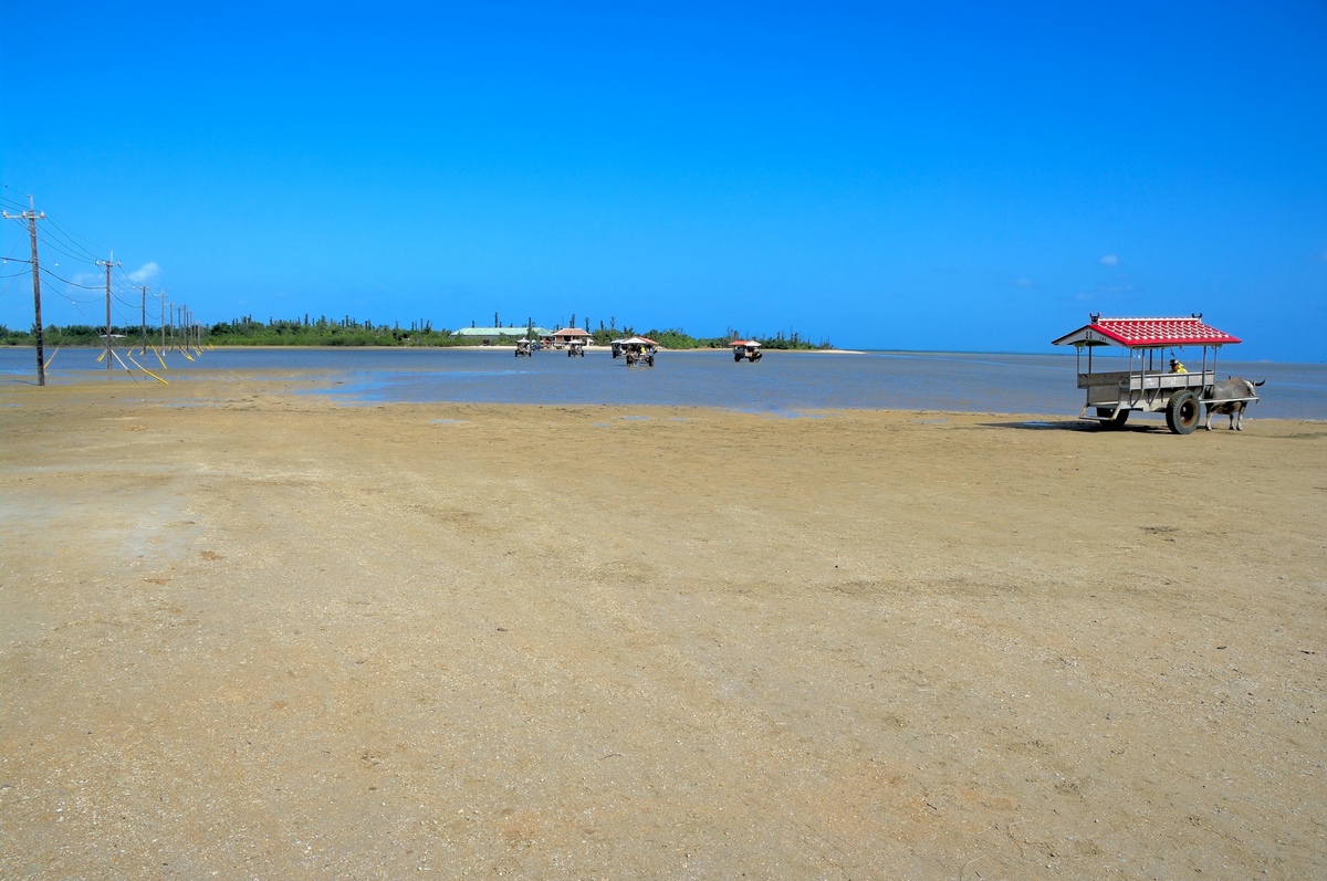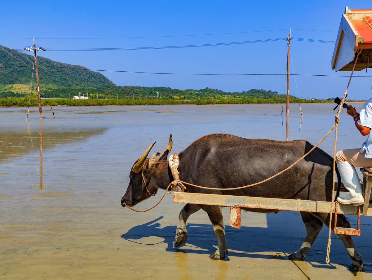 从西表岛到由布岛可以乘坐水牛车或步行渡海。