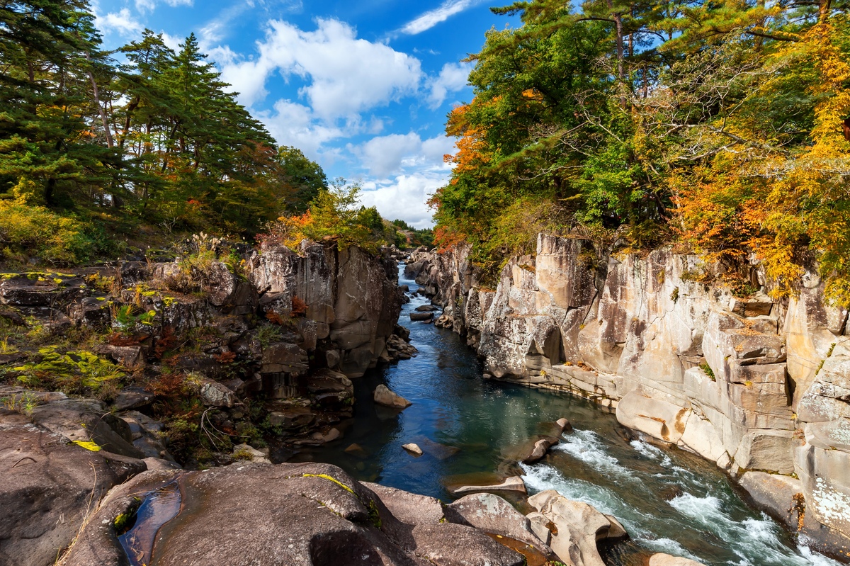 嚴美溪(Genbikei)是由源自栗駒山(Kurikoma-yama)的磐井川(Iwai-gawa)侵蝕形成的峽谷,位於岩手縣一關市,是奇岩、巨岩、甌穴、深淵、瀑布連綿不絕的景勝地。