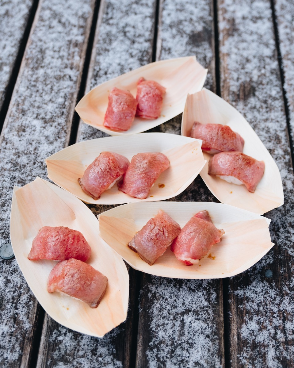 將炙過的飛驒牛放在壽司飯上,並以鹽或醬汁調味,味道絕佳。